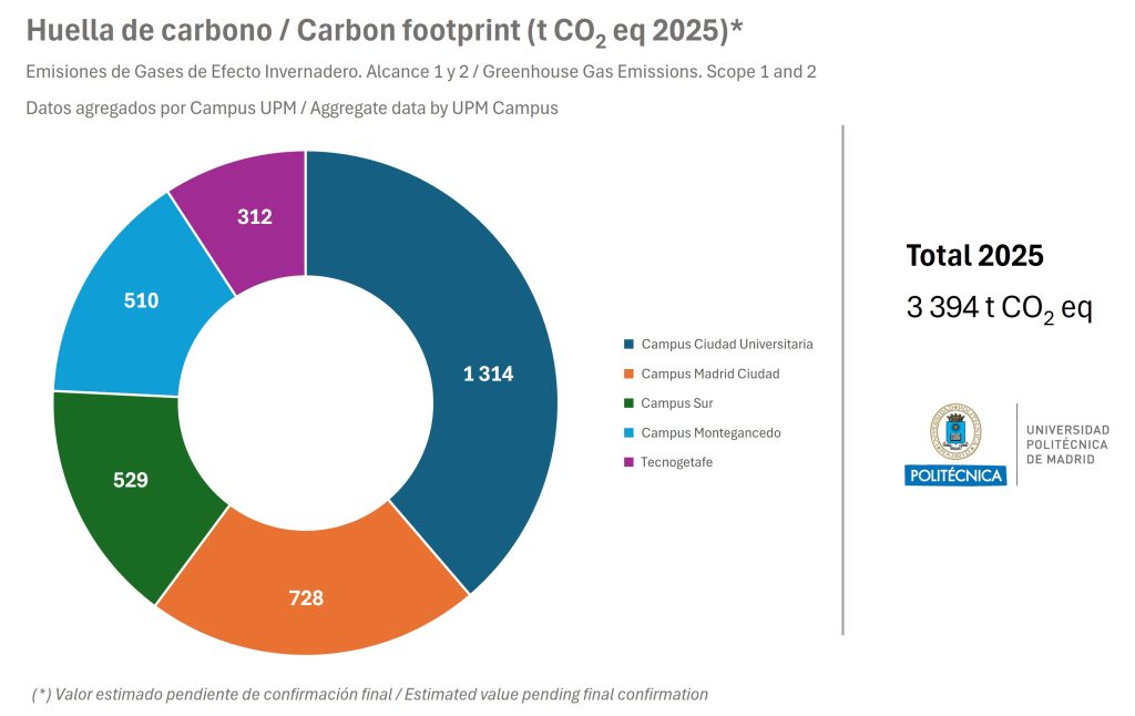La Universidad Politécnica de Madrid se encuentra en el registro de huella de carbono del Ministerio para la Transición Ecológica y el Reto Demográfico, y dispone del sello ‘Calculo y Reduzco’ para el alcance 1+2. El último reporte ha sido para el trienio 2019-2021 (ver información)